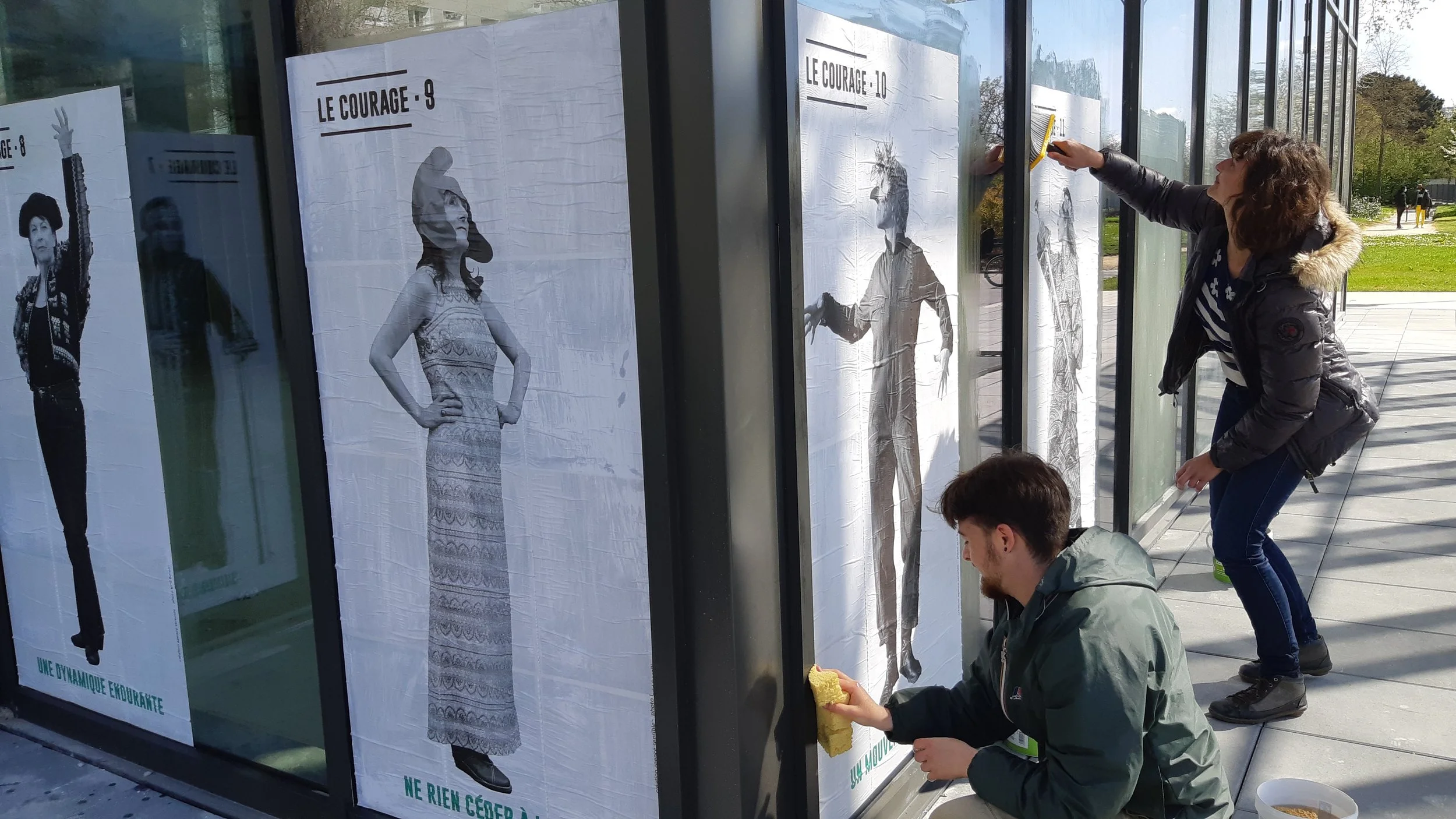 La création d’affiches-portraits : les prises de vues sont retravaillées, passées en noir et blanc, et adaptées à du collage en extérieur. Une collection de grands portraits est ainsi créée. À chaque portrait est associé une définition du courage, extraite des entretiens réalisés avec les participantes.